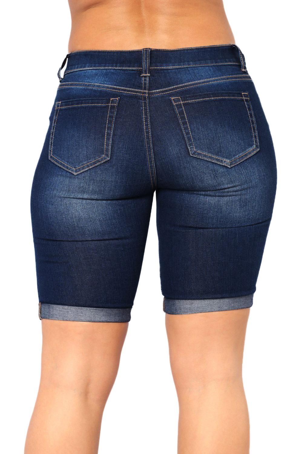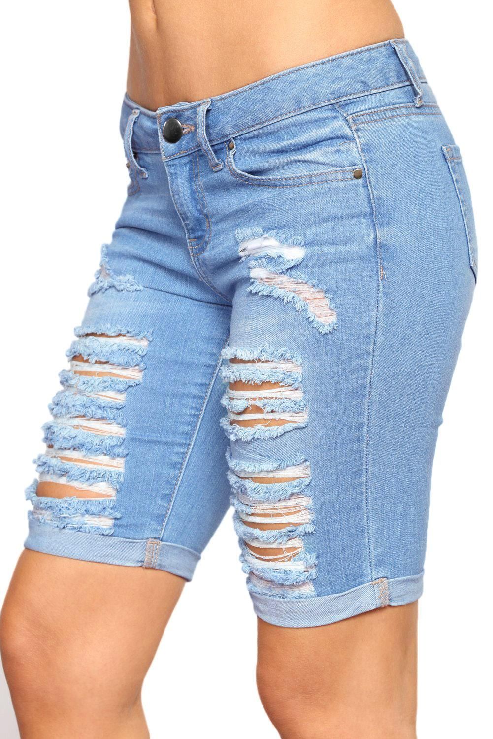 Classic pocket-style, design with belt loops Destroyed denim bodice finished with rolled cuffs Zip fly bronze button closure, cut at above-knee length Made of soft quality fabric blending cotton and spandex It is cool and fashionable to wear such a destroyed shorts womens denim shorts by Dear-Lover for boutique store