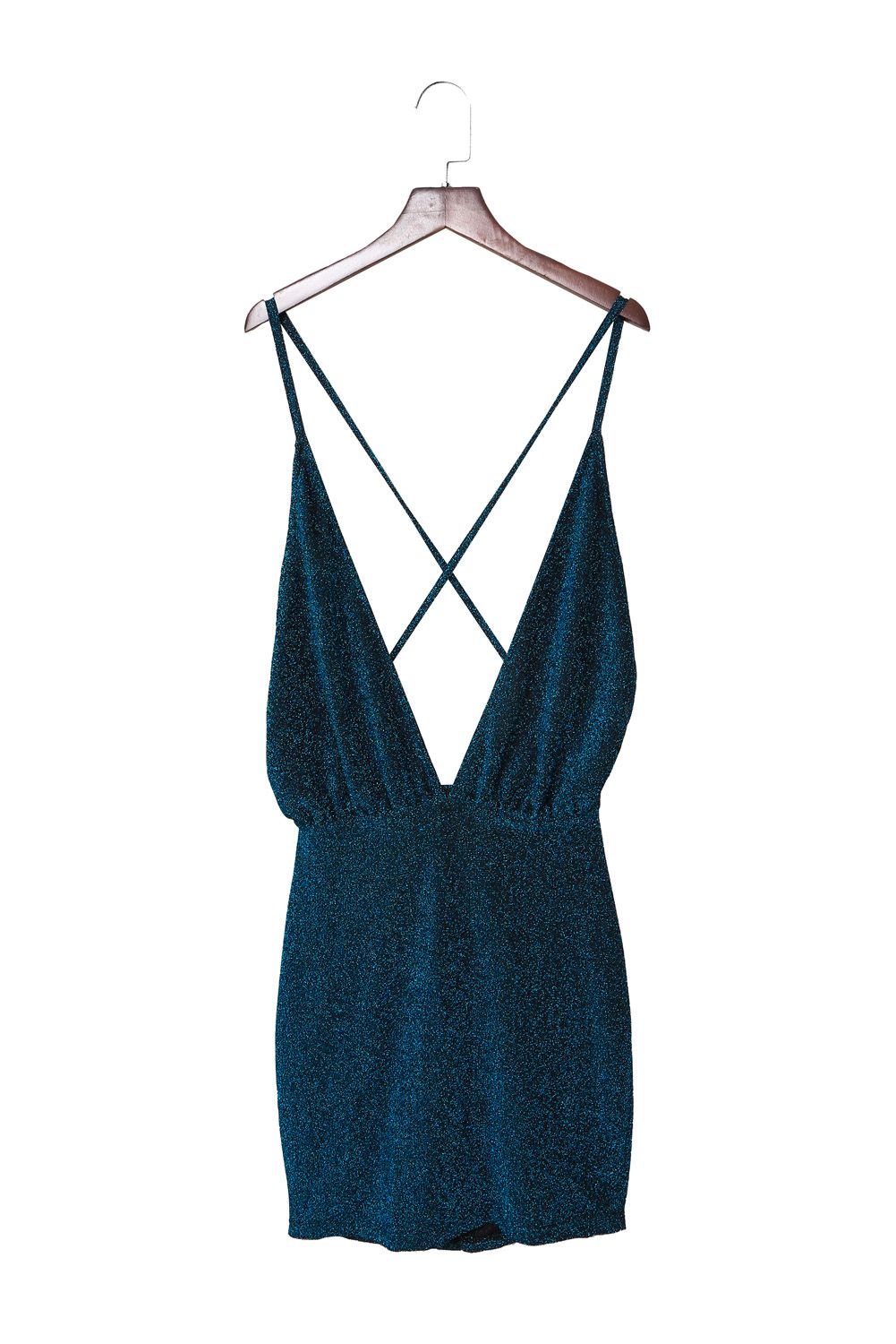 Metallic Deep V Neck Crisscross Backless Bodycon Mini Dress