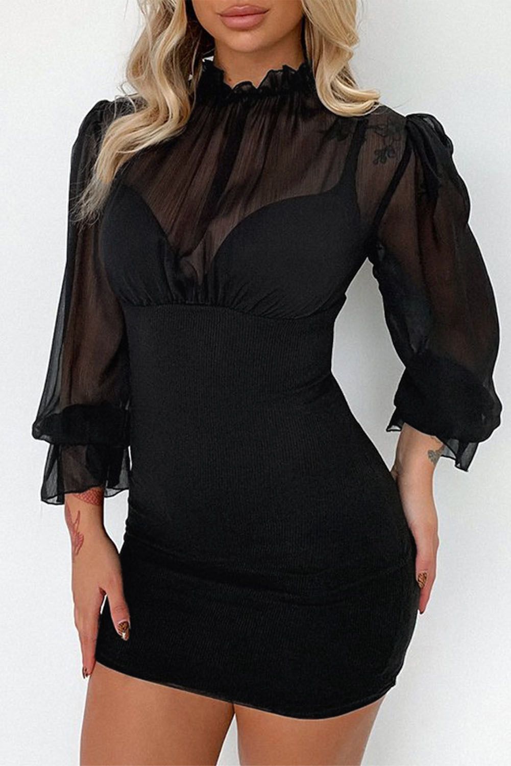 See-through Mesh Patchwork Puff Sleeve Bodycon Mini Dress