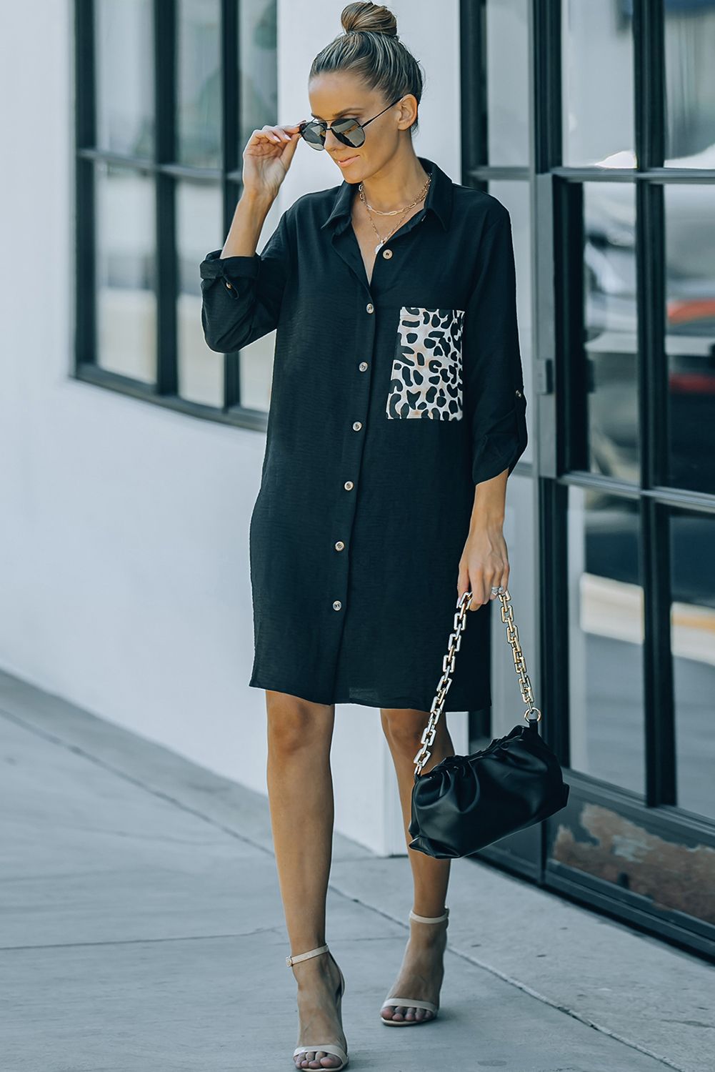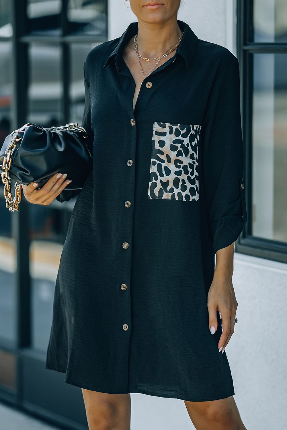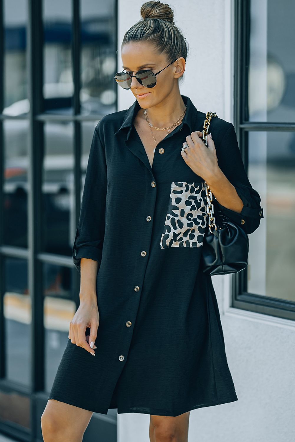Black Cheetah Print Pocket Button Design Casual Shirt