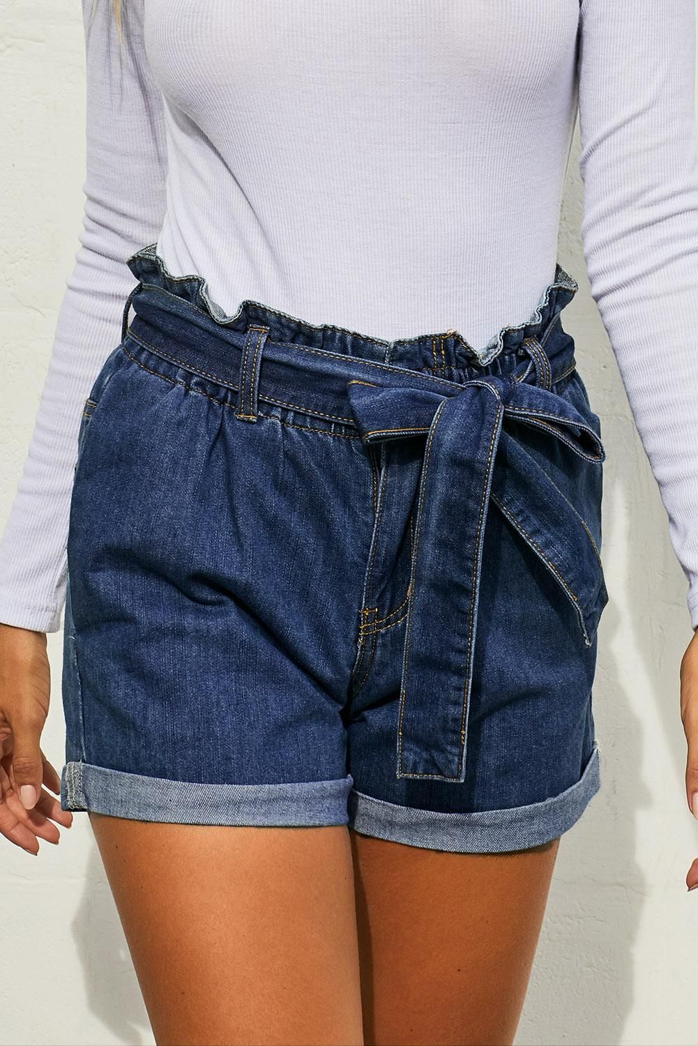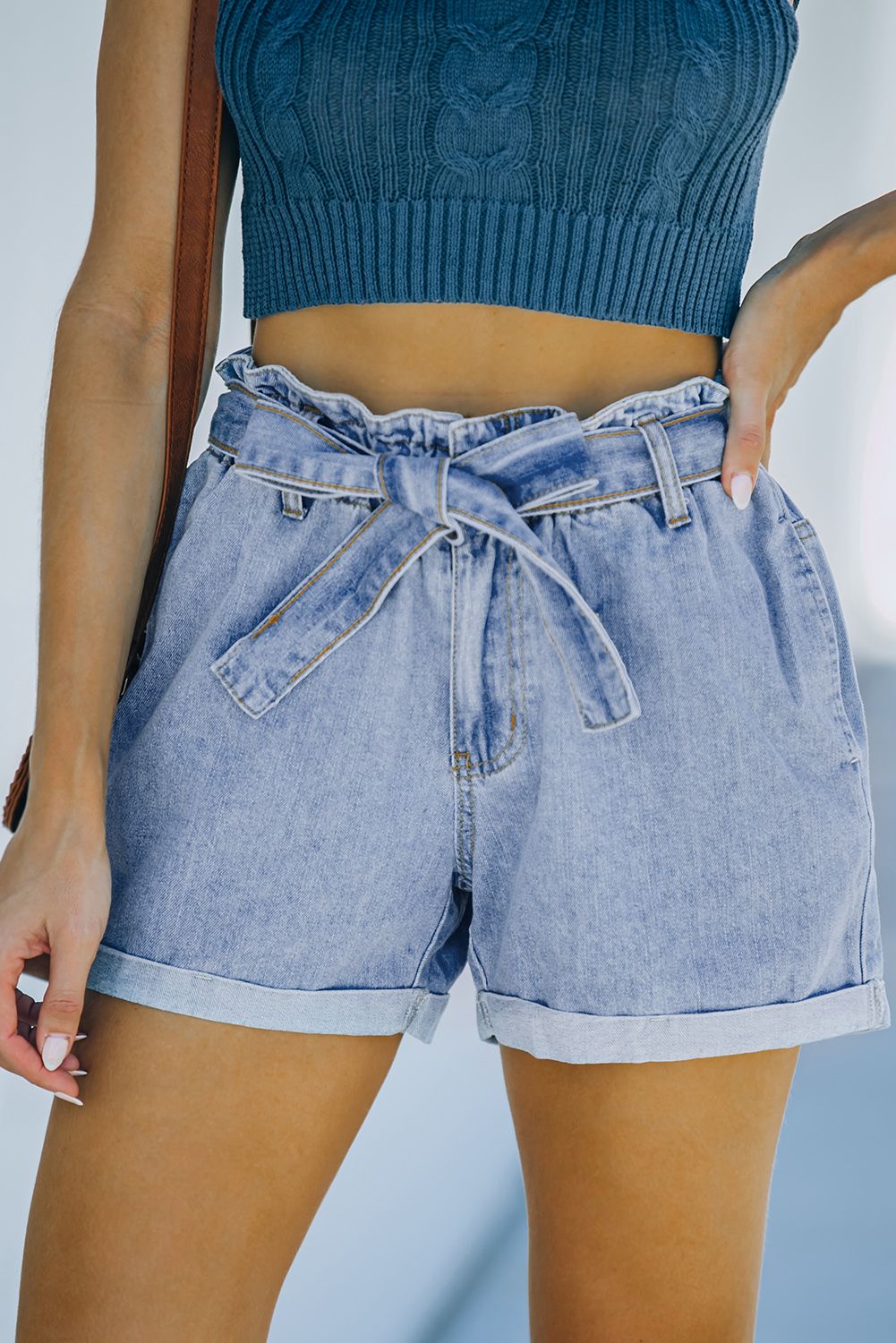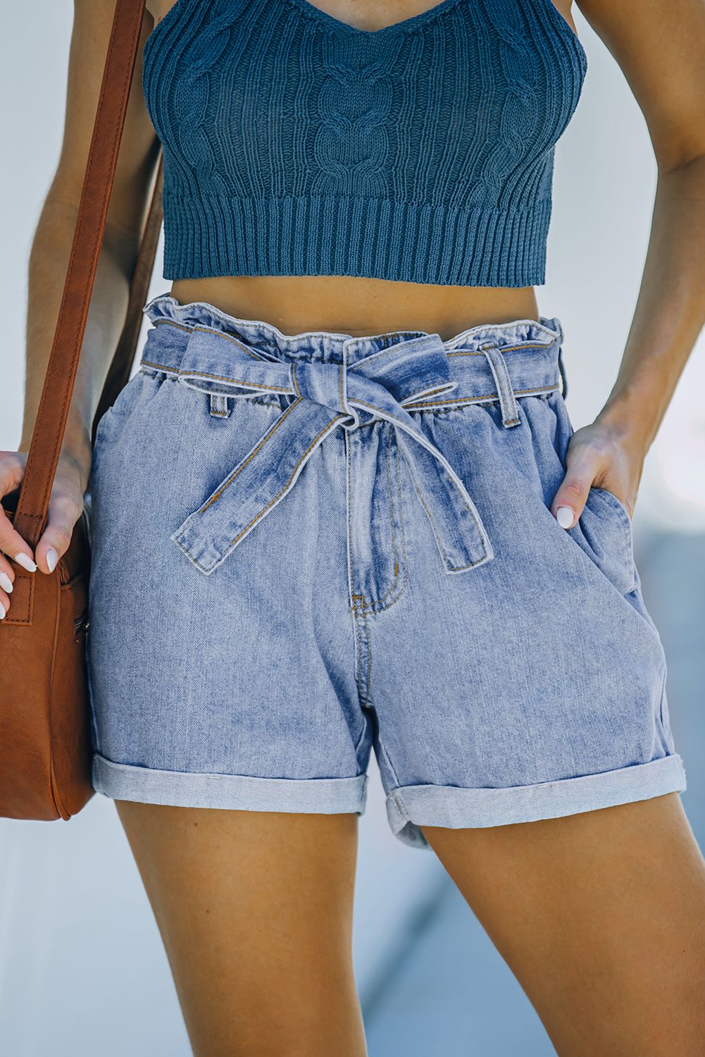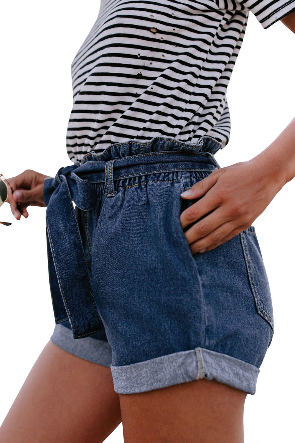 Paper bag waist with detachable sash belt High waist look, relaxed fit, style with pockets Take on mega chic style in these lovely classic denim Made from quality fabric with stretch, comfortable to wear Deliver a high waist cut for the ultimate fashion for women Womens denim shorts are summer essentials for female fashionistas