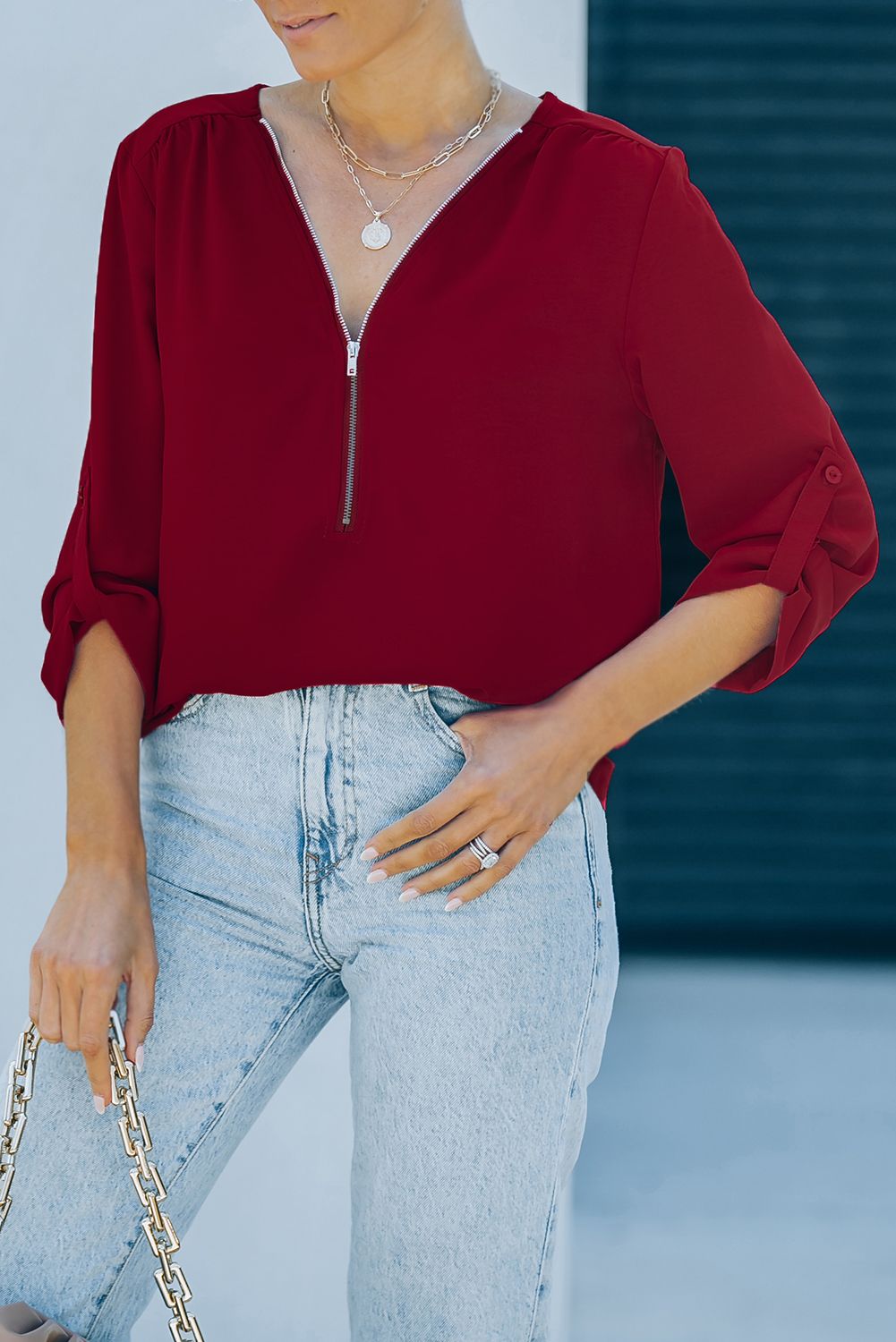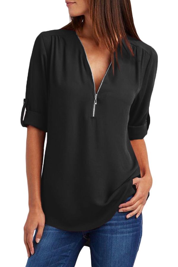 Black Casual V Neck Zip up Half Sleeve Blouse