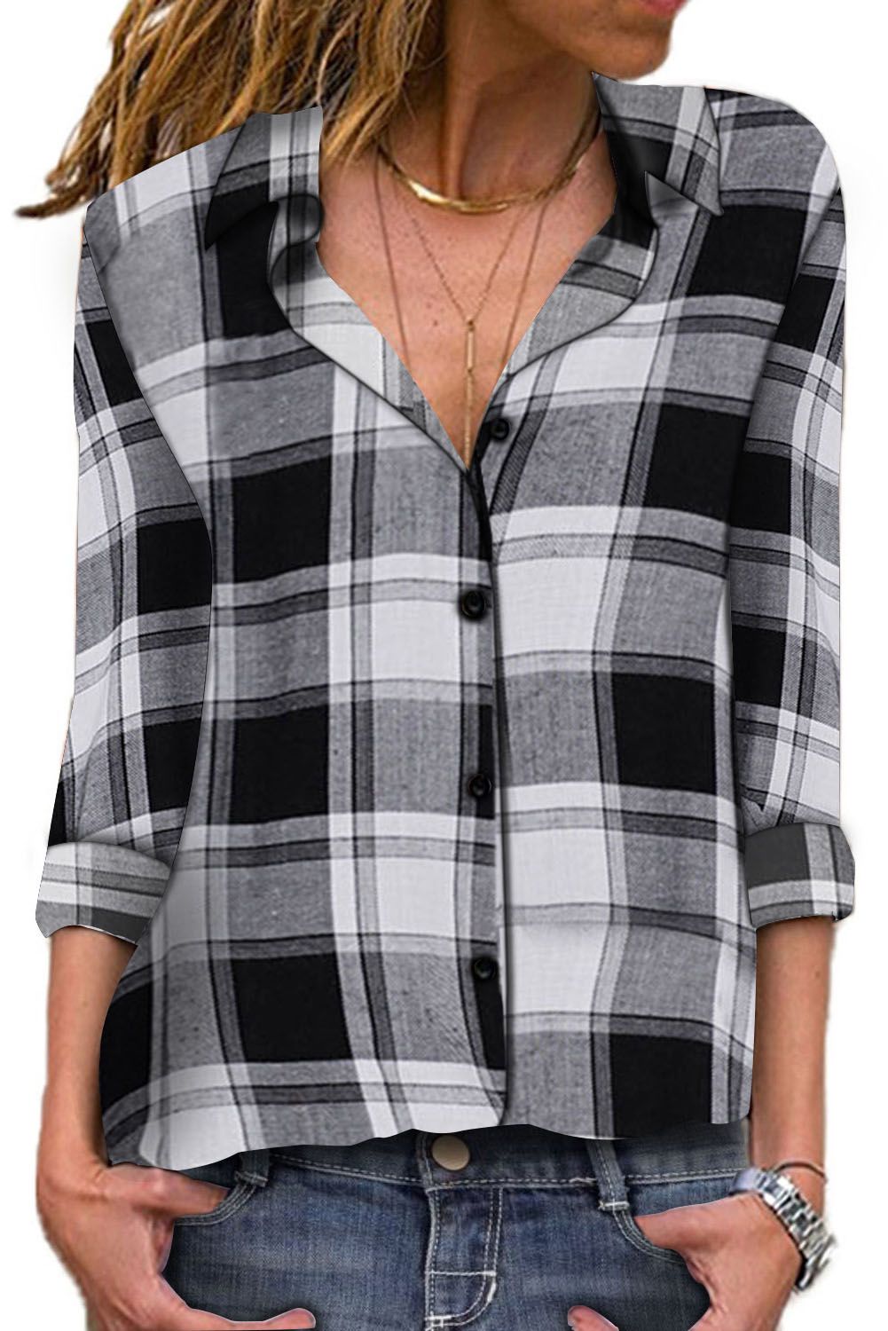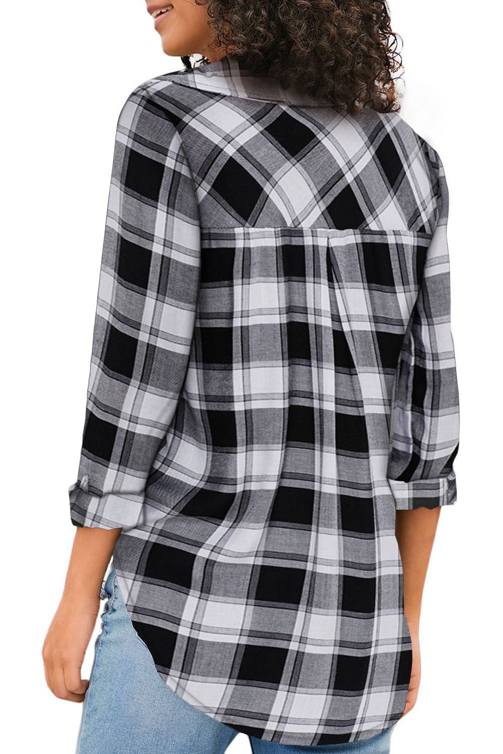 Black V Neck Roll up Sleeve Button Up Plaid Pattern Shirt