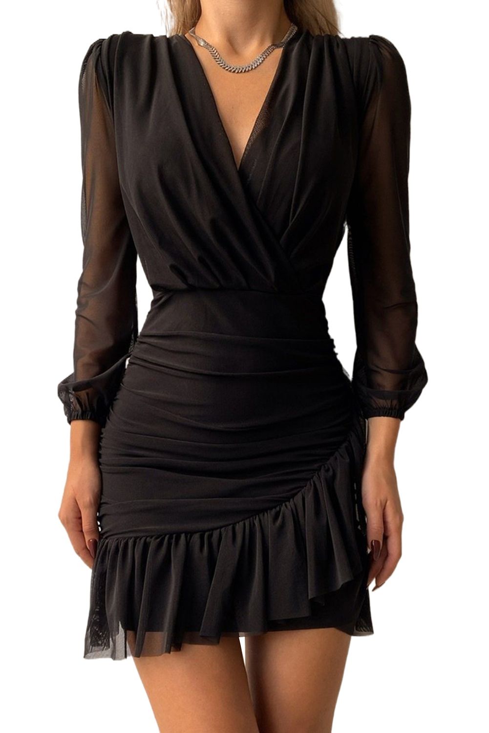 Black Ruched Flounce V Neck Bodycon Mini Dress