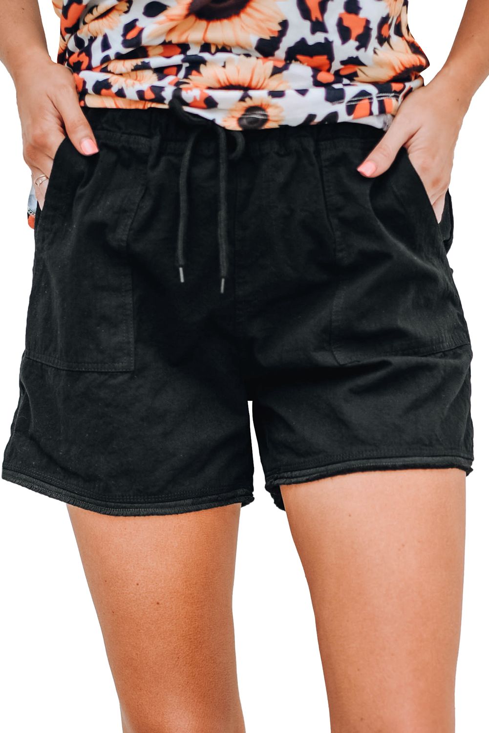 Black Raw Hem Pocketed Drawstring Casual Shorts